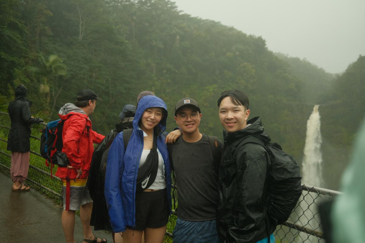 UBC students Josh Lee, Cameron Leong and Jennifer Lim at Hawai'i's Akaka Falls on a very rainy day (photo: Ahmed Neelim Novo)